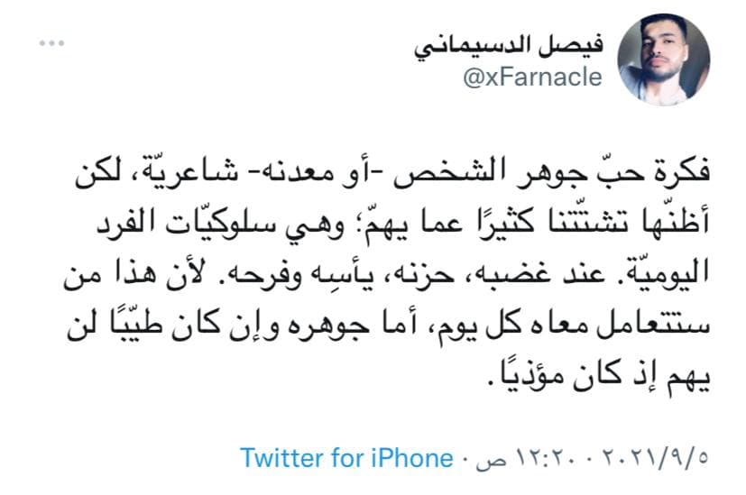 الجّمعـة، الثانية والربع ظهرًا، على الأريكةِ البيضاء، أحظى بوقتٍ هادئ بعدما أنهيتُ كافة الأعمال المنزلية، وفي الخلفيّةِ الصوتية: (أنا محمد الحاجّي، وهذ بودكاست آدم من ثمانية). أُتابع الحاجي من سنواتٍ طويلة، وفي أوقاتٍ سابقة كان هو الشّخص الوحيد الذي احتمل الاستماع إليه لأتفكّر وأتدبّر، وفي لحظاتٍ أخرى كنت أتقبّل النصيحة منه فقط وأرفضها من غيره. بخلاف أن تخصصه كان من طموحاتي التي تخلّيت عنها، يتناول في الحلقة هذه الطموحات الخاطئة والتخلِّي عنها، أعتقد أنّ العنوان بذاته يضرب بقعةٍ عميقةٍ داخلي! فأنا بذاتي أعيش طموحًا خاطئًا، ولكني أرفض التخلِّي عنه بأسبابي الخاصّة، يقول محمد: “هذه كلّها تكاليف غارقة، تجعل التخلّي قرارًا صعبًا للغاية، وتجعلنا نستمر حينما تجب علينا المُغادرة”، وفي موضعٍ آخر يقول: “نشعر بحميمية مع قراراتنا”، وهذا ما يُبرّر لي الاستمرار في طريقي، وبما أراه؛ فلم تكن المساوئ المقدرة مجدية للتخلِّي، وربما من الأساس هذا الطموح ليس خاطئًا وأنّ المشكلة في نظرتي أنا ومحيطي. نعم.. هذه مشكلات الإنسان.